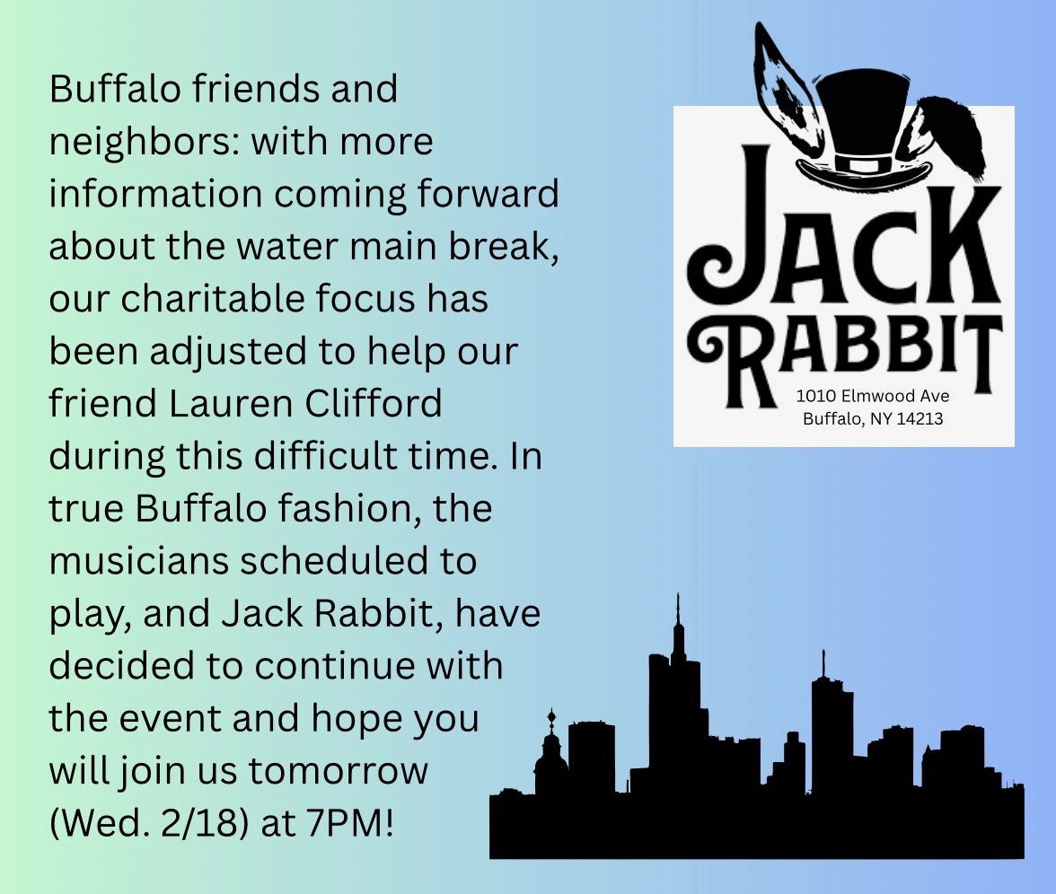 Proceeds from the Wednesday, February 18 (tonight!) event at Jack Rabbit have been earmarked to help Buffalo musician Lauren Cliffrod, who lost the car she’d purchased the day prior to the Hertel flood. You can read about the February 21 benefit at Nietzsche’s and the February 28 event at Hot Mama’s below.